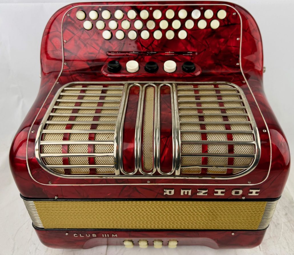 Hohner Club III M £295.00 2 1/2 Row Diatonic C/F ,30 Key 8 Bass , 3 voice LMM Musette Tuned , 5.4 KG , 5 Treble 0 Bass couplers , Comes with Hard Case and strap, 1 Years warranty